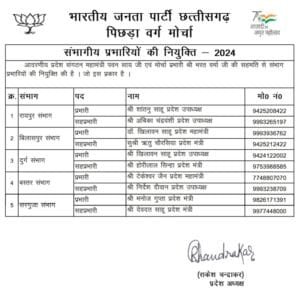 भाजपा पिछड़ा वर्ग मोर्चा प्रदेश अध्यक्ष राकेश चंद्राकर ने आगामी लोकसभा चुनाव को देखते हुए घोषणा की, संभाग प्रभारियों की